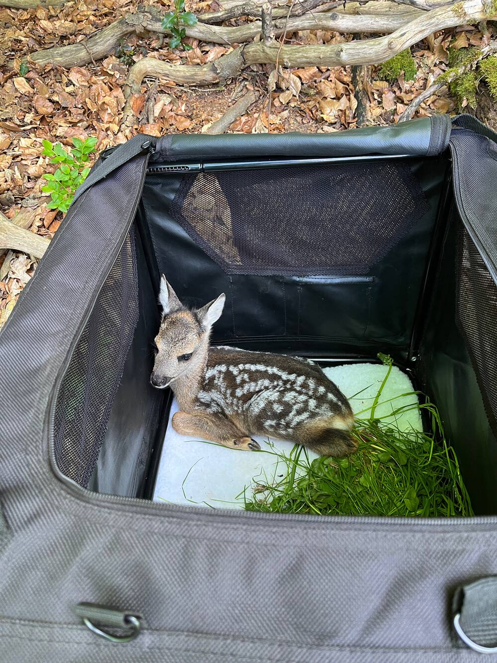 Ein Kitz, das sich perfekt getarnt hatte, verriet sich selbst mit einem kurzen Laut. Ohne diesen Moment hätten wir es wohl übersehen. Auch dieses Kitz wurde geborgen und sicher untergebracht.