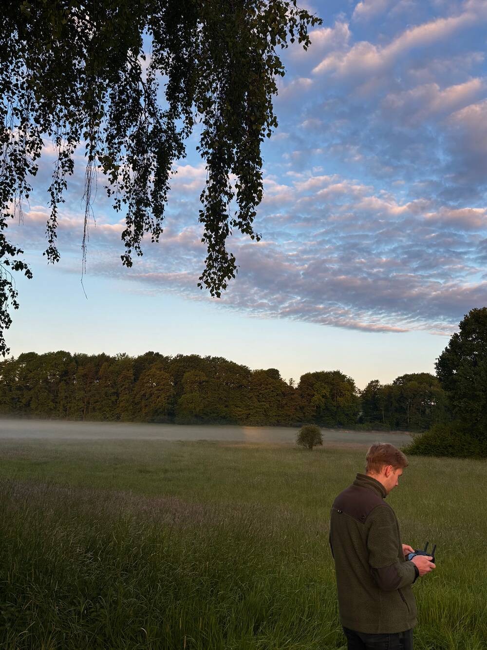 Gemeinsam mit Leon, der bei uns im Hegering die Drohne fliegt starten wir also mit der ersten Fläche. Es kommt selten vor, dass zu der Uhrzeit auch schon der Landwirt mit vor Ort ist, wodurch wir meistens zu zweit sind. Manchmal bekommen wir aber auch noch weitere Unterstützung.