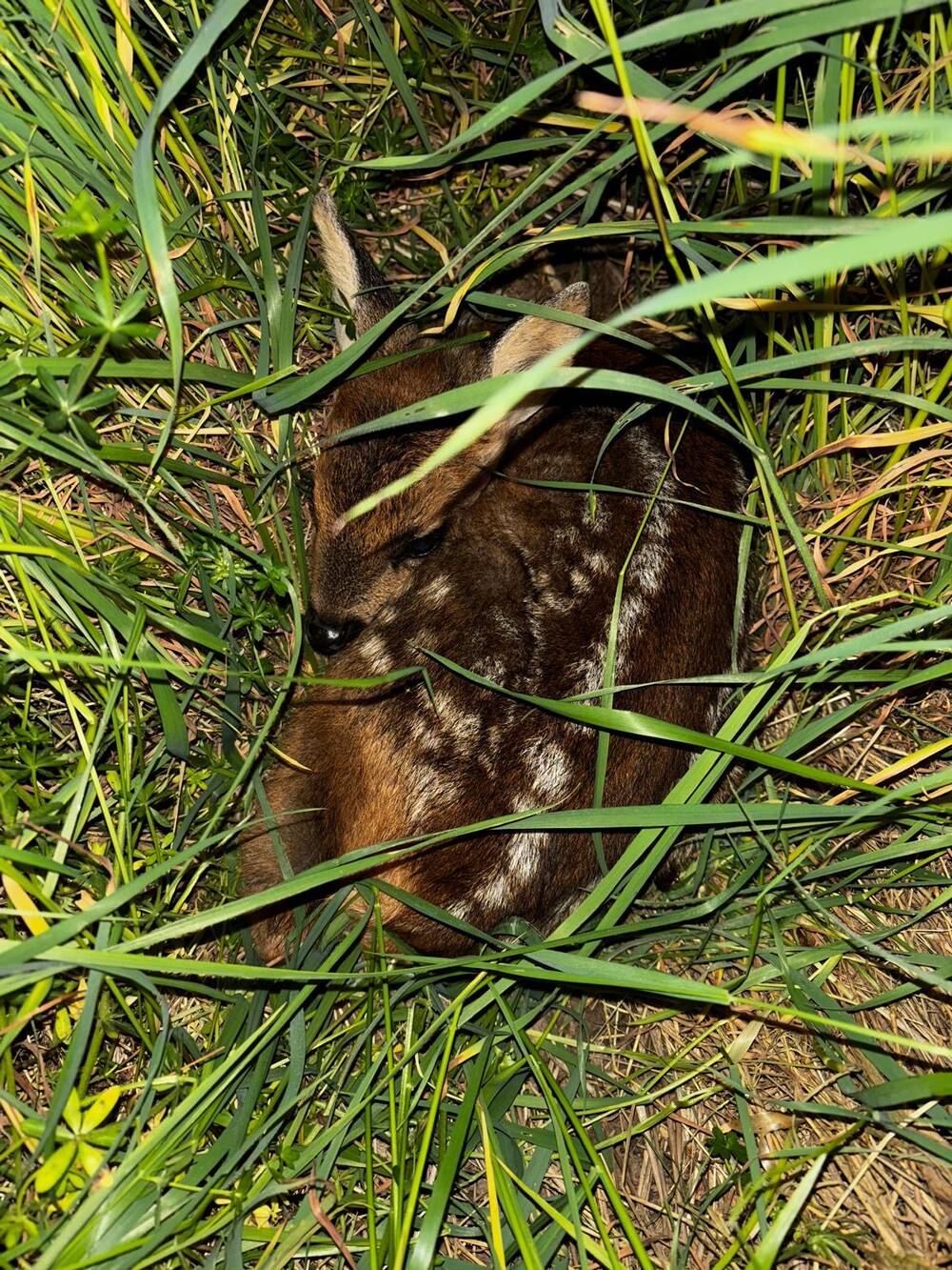 Am nächsten Morgen machte ich mich erneut auf den Weg – diesmal mit meinem Rauhaardackel Casper. Mit feiner Nase und großem Eifer durchkämmte er die Wiese systematisch. Nach etwa einer Stunde zeigte er deutlich an – er verharrte reglos, die Rute gespannt. Im hohen Gras, nur wenige Meter vom Ort des Geschehens entfernt, lag tatsächlich ein Kitz. Es war sichtlich geschwächt, aber lebendig.