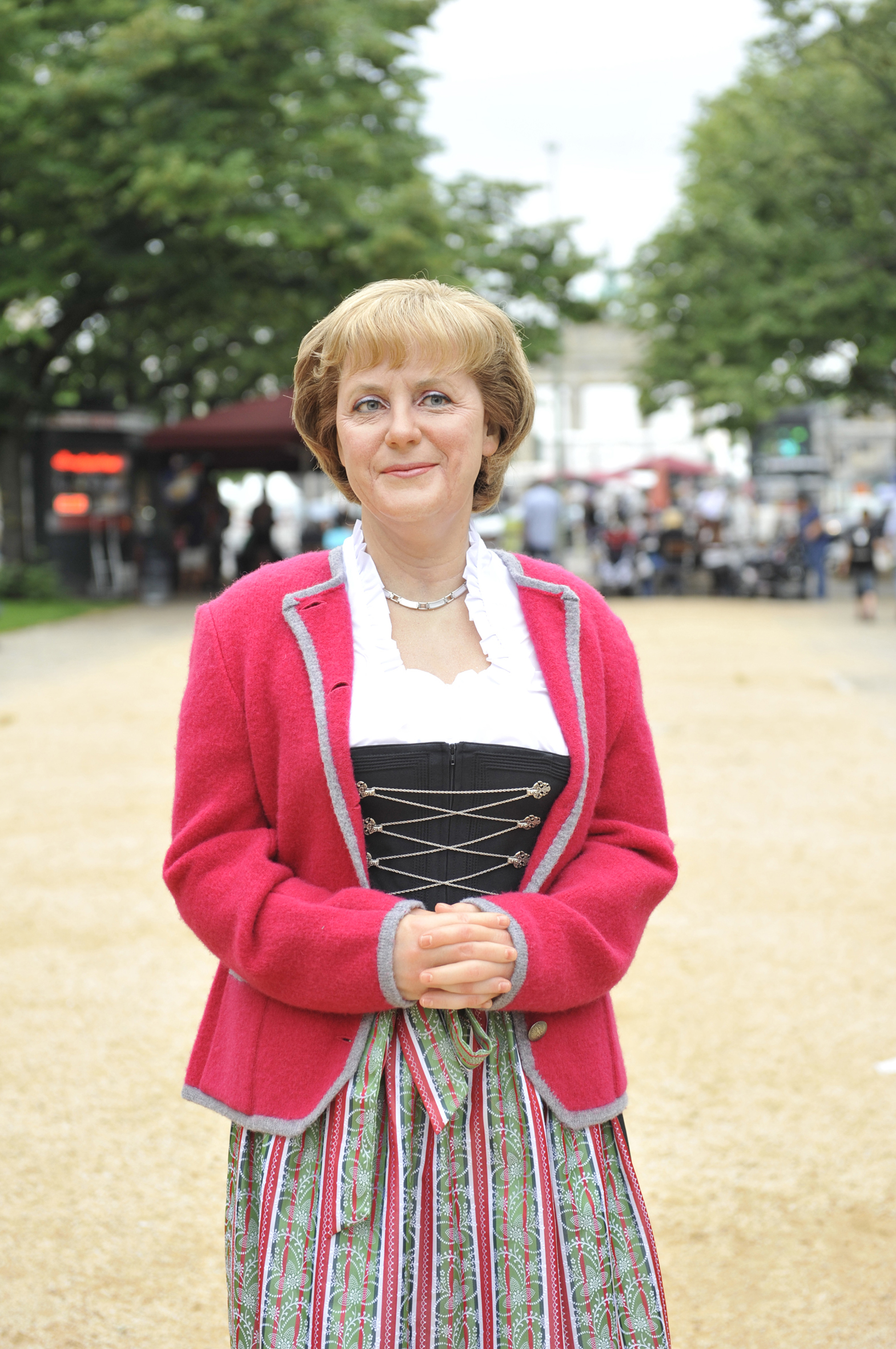 Die vielen Besucher bei Madame Tussauds in Berlin staunten nicht schlecht, als Angela Merkel im trendigen Dirndl von Frankonia plötzlich auf dem Bummelboulevard vorm Brandenburger Tor auftauchte. Nina Zerbe, Marketing-Managerin bei Madame Tussauds: "Als wir hörten, dass die Kanzlerin in Tirol und Bayreuth Urlaub macht, haben wir sofort reagiert und die Wachsfigur umgezogen! Unsere Besucher finden es so toll, dass sie jetzt die kommenden 14 Tage so bleiben wird!"