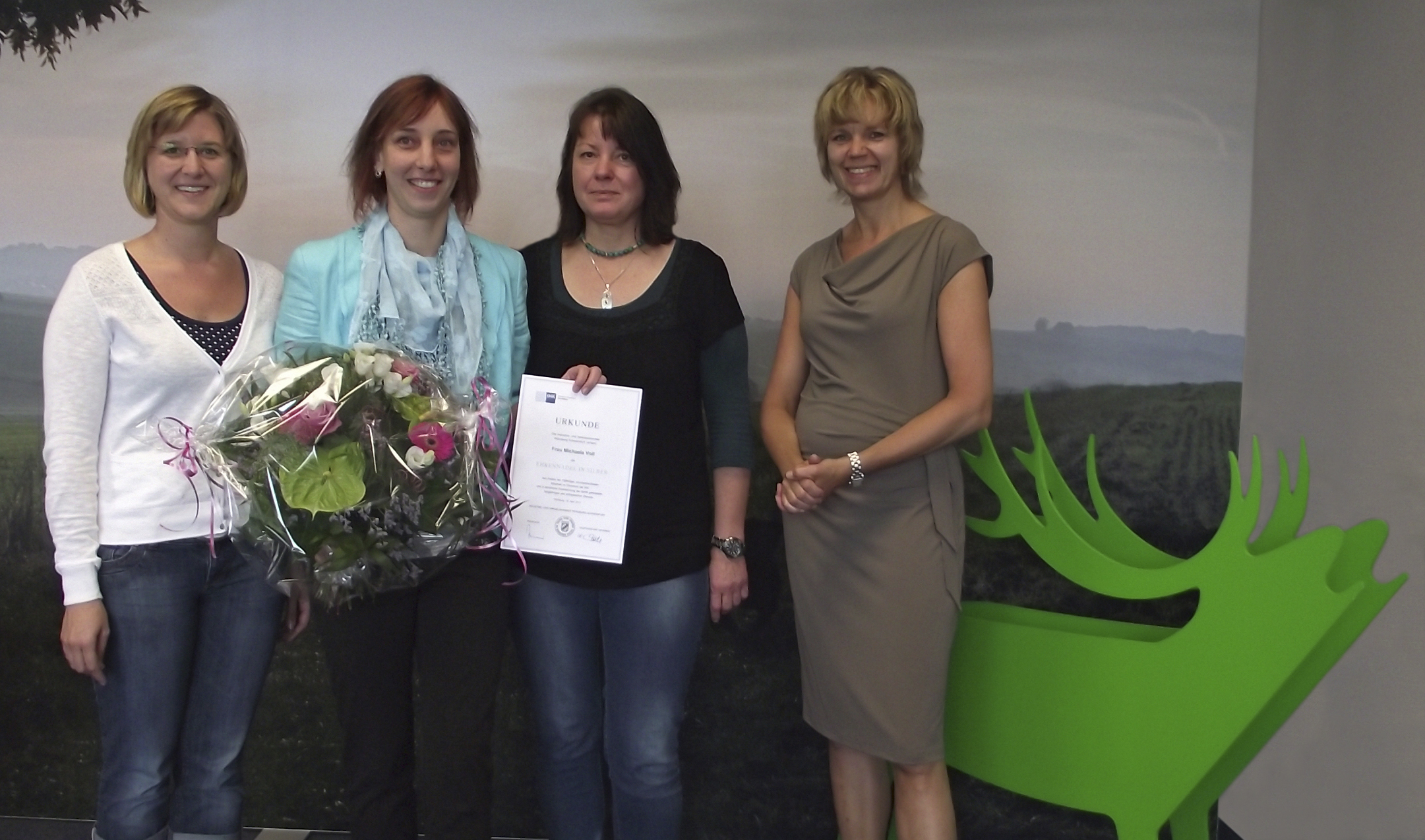 10 Jahre persönliches Engagement im Prüfungsausschuss der IHK Würzburg-Schweinfurt. Für diesen treuen ehrenamtlichen Einsatz wurde Michaela Voll mit der IHK-Ehrennadel in Silber ausgezeichnet. Welchen Stellenwert diese Leistung auch für Volls Arbeitgeber, den Jagdausstatter FRANKONIA, besitzt, zeigte sich deutlich: Geschäftsführerin Jutta Warmbier persönlich überreichte im Rahmen einer Feierstunde die Auszeichnung samt Urkunde und Blumenstrauß. "Wir unterstützen es, wenn Mitarbeiter gesellschaftliche Verantwortung übernehmen". FRANKONIA ermöglicht Voll durch eine flexible Arbeitszeitlösung die Ausübung ihres Ehrenamtes. Auch die Teamleiter Kerstin Bartoschek und Marianne Wuttke ließen es sich nicht nehmen, ihrer tüchtigen Mitarbeiterin zu gratulieren. |