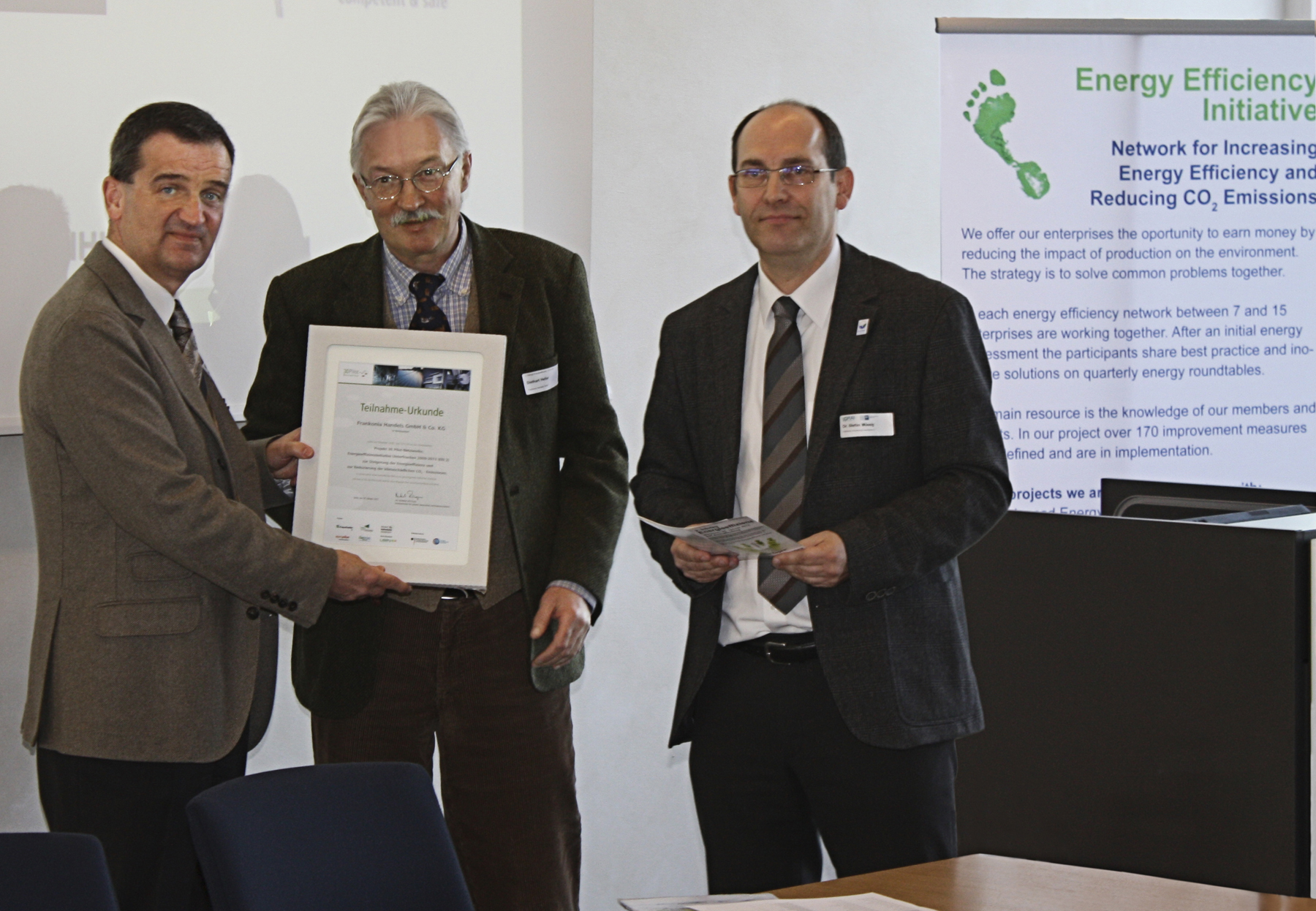 FRANKONIA wird für die erfolgreiche Umsetzung seiner Energie-Effizienzmaßnahmen ausgezeichnet. V.l.n.r.: Martin Suffel, Präsident der IHK Aschaffenburg, Diethard Heller, Umweltbeauftragter FRANKONIA, Dr. Stefan Müssig, 1. Vorsitzender des Förderkreises Umweltschutz Unterfranken e.V. |